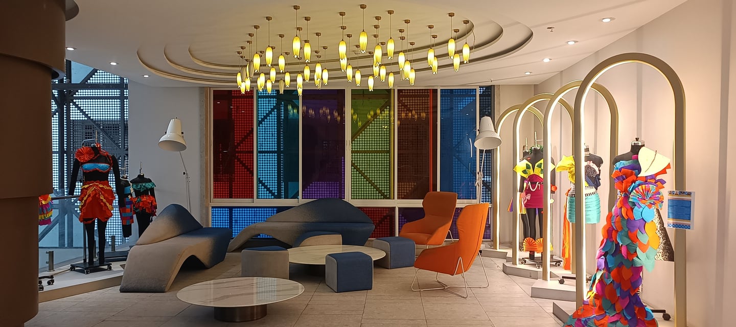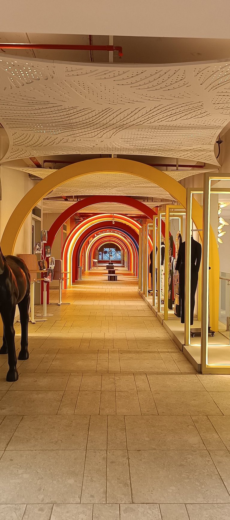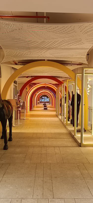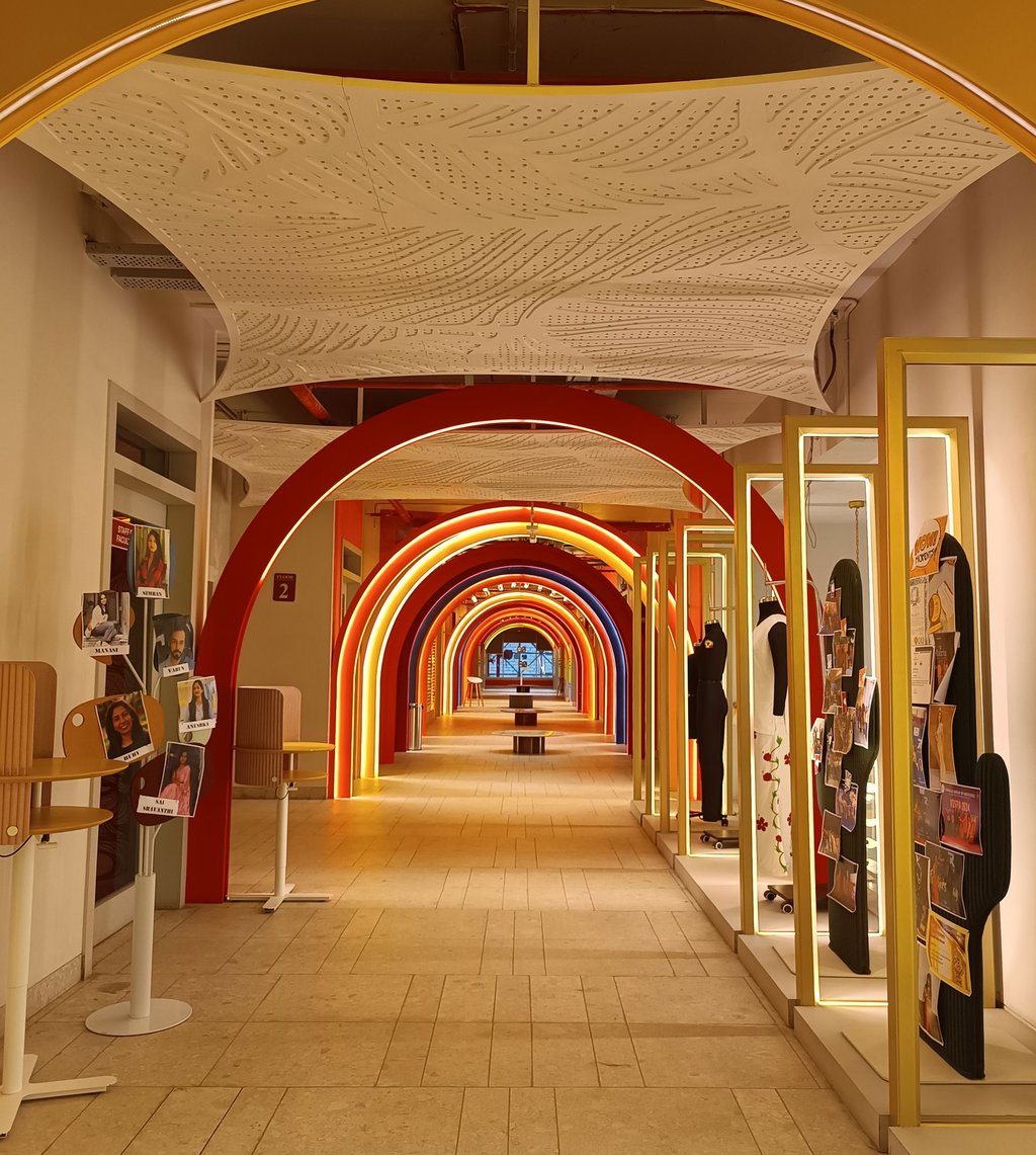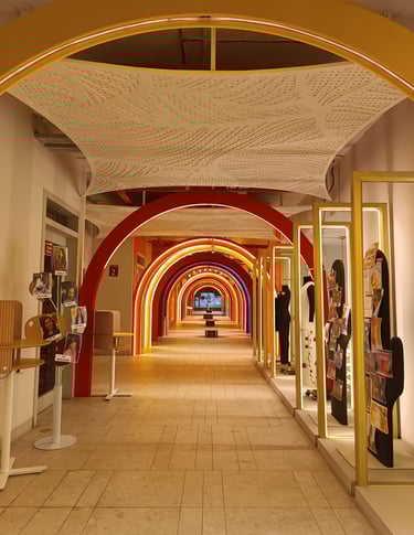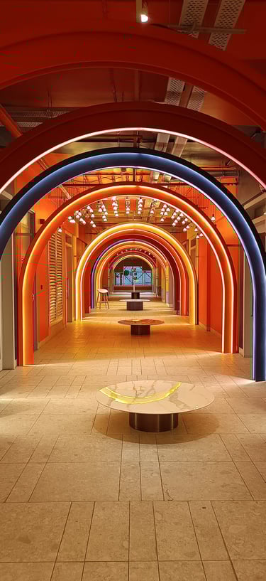 Vibrant, neon-lit arches create a dynamic runway tunnel, framing eclectic mannequins against bold, pop-art murals for an immersive fashion experience.