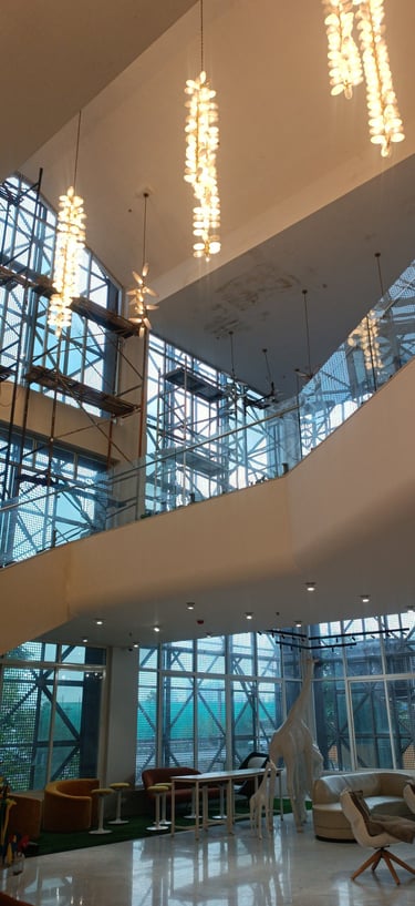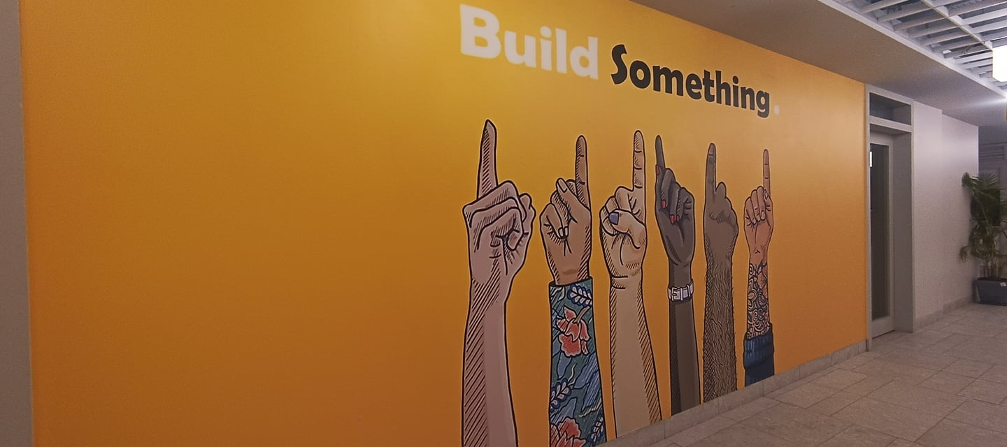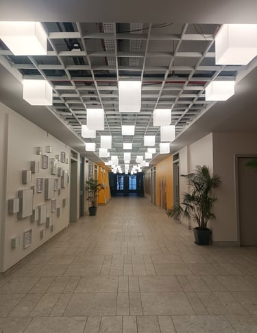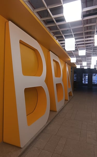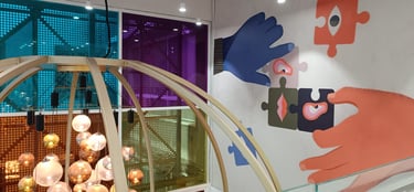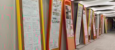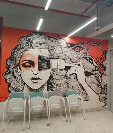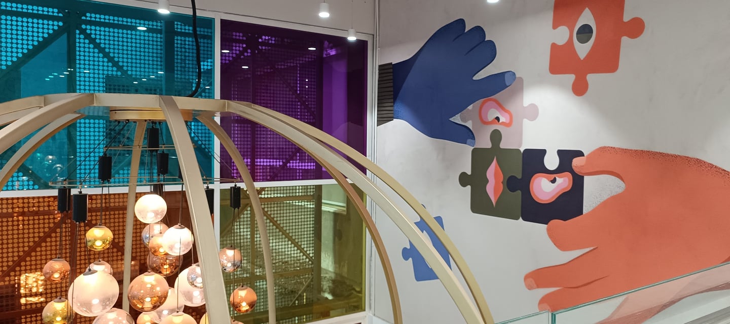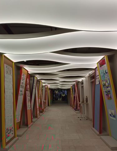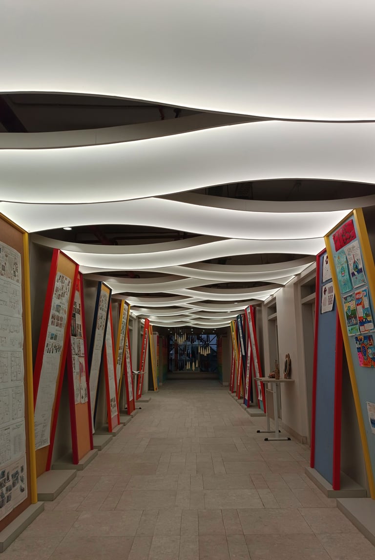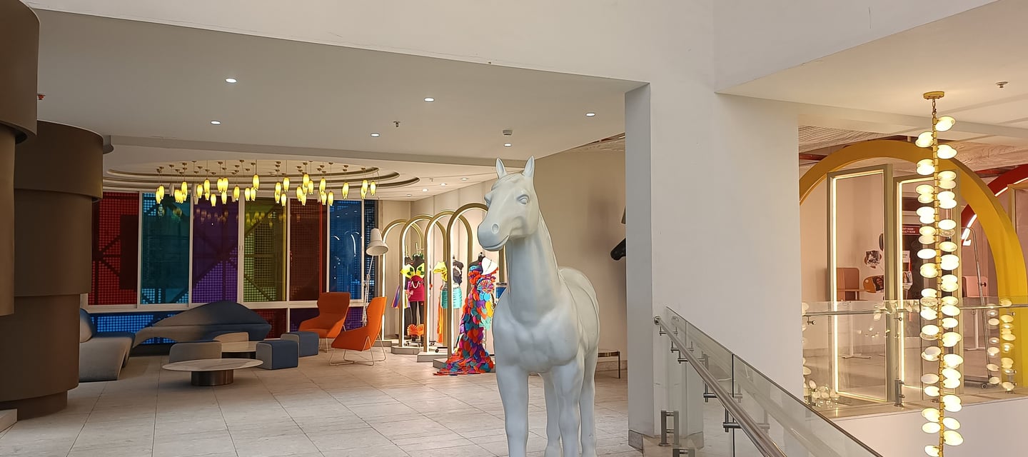 Vibrant, neon-lit arches create a dynamic runway tunnel, framing eclectic mannequins against bold, pop-art murals for an immersive fashion experience.